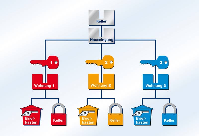 - Wer eine umfangreiche Beratung für eine Schüsselanlage im Eigenheim möchte, der ist bei uns genau richtig. Diese ist meistens für Mehrfamilienhäuser angebracht aber auch für kleinere Häuser oder große Firmen. Man kann durch den Schließplan alles Regeln und somit festlegen wo der Schlüssel passen darf und wo nicht. Bei einer klassischen Zentral-Schliessanlage passt Ihr Wohnungsschlüssel eigentlich immer in Ihrer Wohnungstüre, in der Haustüre, in Ihrem Kellerraum oder in Gemeinschaftsräumen wie Waschküchen, Garagentoren oder Tiefgaragen Einfahrten. Da bei einer durch uns gut geplanten Schließanlage meist viele andere Schlüssel wegfallen, haben Sie somit auch einen kleineren Schlüsselbund und dadurch auch eine einfachere Schlüsselverwaltung. Die Beratung durch uns im Unternehmen ist umfangreich und Fragen werden von uns umgehend beantwortet. Nach der Beratung erstellen wir Ihnen gerne ein unverbindliches Angebot Ihrer gewünschten neuen Schließanlage. Wir können Ihnen verschiedene Schließanlagen Modelle mit unterschiedlichen Sicherheitsaspekten anbieten. Wenn soweit alles passt und Sie mit unserem Preis zufrieden sind, dann kann die Bestellung erfolgen. Je nach Anlage und Hersteller kann eine neue Schließanlage 2-4 Wochen Lieferzeit mit sich mitbringen. Sobald diese bei uns eingetroffen ist, erfolgt nach Absprache mit Ihnen kurzfristig die Montage vor Ort bei Ihnen. Eine Schlüsselübergabe und besprechen des Schließplanes ist nach Montage selbstverständlich. Zu jedem Schließanlagensystem gibt es eine Sicherungskarte, die sicher aufbewahrt werden sollte. Nur mit dieser Karte sind spätere Nachbestellungen möglich. Zudem erhalten Sie durch uns noch einige Pflegetipps für Ihre neue Schlüsselanlage. Falls Sie später noch irgendwelche weitere Schlüssel oder neue Zylinder benötigen sprechen Sie uns einfach darauf an. Wir unterbreiten Ihnen ein übersichtliches und faires Nachkauf Angebot. So nun können Sie einen Schlüssel mehrere Schlösser nutzen. Eine spätere Wartung Ihres Schliesssystemes kann von uns natürlich nach Abgabe eines Angebotes auch übernommen werden.